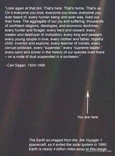 Σκεφτείτε το για μια στιγμή… Ό,τι έχουμε ζήσει, οτιδήποτε έχει ζήσει ο οποιοσδήποτε έζησε ποτέ, οποιονδήποτε γνωρίζουμε ή έχουμε ακούσει γι’ αυτόν μέσα από ιστορίες, όλες οι ιστορίες του κόσμου μας έχουν εκτυλιχθεί και εκτυλίσσονται πάνω σε 1 απροσμέτρητα ασήμαντο, μικροσκοπικό κομμάτι βράχου που επιπλέει με άγνοια στο διάστημα γύρω από 1 ευτελές μικρομεσαίο άστρο, που επιπλέει αδιάφορα γύρω από το κέντρο 1 επουσιώδους γαλαξία, ο οποίος επιπλέει άσκοπα στη δυσθεώρητα αχανή κενή μαυρίλα του παρατηρήσιμου σύμπαντος (το οποίο, παρεμπιπτόντως, έχει διάμετρο περίπου 93 δισεκατομμύρια έτη φωτός – τουτέστιν: μια ακτίνα φωτός που ταξιδεύει με την ασύλληπτη ταχύτητα των 300 χιλιάδων χλμ. το δευτερόλεπτο(!) χρειάζεται 93 δισεκατομμύρια χρόνια(!!!) για να το διασχίσει απ’ άκρη σ’ άκρη!)∙ και, εκτός του ότι υπάρχει περισσότερο «σύμπαν» από αυτό που παρατηρούμε, υπάρχουν βάσιμες υποψίες ότι υπάρχουν κι άλλα-ξεχωριστά σύμπαντα! – Πόσα; Ίσως όσα διαφορετικά πιθανά σχήματα προκύπτουν από τα μαθηματικά της θεωρίας χορδών για τις έξτρα χωρικές διαστάσεις: 10500 (αλλιώς: ο αριθμός 1 με 500 μηδενικά να τον ακολουθούν!). Ίσως, όμως, και άπειρα… –