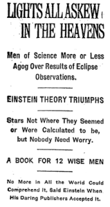 Άλλη μια αληθινά συγκλονιστική πρόβλεψη-επακόλουθο της σχετικότητας ήταν ότι η παρουσία αρκετής μάζας στον χώρο μπορεί να τον παραμορφώσει τόσο έντονα, ώστε να είναι εφικτό να κάμπτονται ακόμα και ακτίνες φωτός!! Στις 22 Σεπτεμβρίου του 1919, λίγους μήνες μετά το περίφημο «πείραμα Eddigton» (επικεφαλής του πειράματος ήταν ο αστροφυσικός Άρθουρ Έντινγκτον), το παρατηρησιακό τεστ της Γενικής Σχετικότητας στο οποίο αποδείχθηκε ότι ο ήλιος πράγματι κάμπτει το φως, ο Αϊνστάιν έλαβε ένα τηλεγράφημα που του γνωστοποιούσε την οριστική επαλήθευση της θεωρίας του. Μάλιστα, ο μύθος λέει ότι παρούσα στη θριαμβική του επιβεβαίωση ήταν και μια μαθήτριά του, η Ilse Schneider, η οποία τότε τον ρώτησε: «Καθηγητά Αϊνστάιν, τι θα λέγατε αν οι παρατηρήσεις δεν είχαν επιβεβαιώσει την πρόβλεψή σας;», με τον Αϊνστάιν να απαντά: «Θα στεναχωριόμουν για τον Κύριο, γιατί η θεωρία ΕΙΝΑΙ σωστή…» [4]