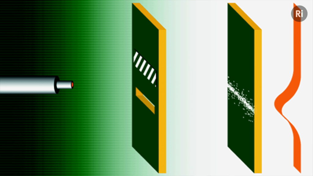 Το εκπληκτικό είναι ότι το αποτέλεσμα δεν επηρεάζεται από τον ρυθμό με τον οποίο διασχίζουν το φράγμα: ακόμα και αν στέλνεις ένα μοναδικό ηλεκτρόνιο τη φορά, προκειμένου να αποφευχθεί κάποιο ενδεχομένως αποπροσανατολιστικό για το αποτέλεσμα ανακάτεμά τους, δεν αλλάζει κάτι∙ ξανά, εμφανίζεται το μοτίβο συμβολής! Μοιάζει, δηλαδή, σαν το κάθε μεμονωμένο ηλεκτρόνιο να περνά σαν κύμα και από τις δυο σχισμές! Με έναν εντελώς μυστήριο τρόπο, το ηλεκτρόνιο φαίνεται ότι περνά ως απλωμένο κύμα από τις σχισμές και προσγειώνεται ως διακριτό σωματίδιο με συγκεκριμένη μάζα στην οθόνη ανίχνευσης!