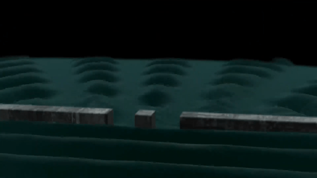 Πράγματι, αν πυροβολήσουμε ηλεκτρόνια στο φράγμα και με τις δυο σχισμές ανοιχτές, θα δούμε κάτι διαφορετικό(!!) από το μοτίβο με τις δυο λωρίδες αποτυπωμάτων πίσω από τις δύο σχισμές (όπως θα βρίσκαμε στην περίπτωση με τα κεράσια). Αν εκτοξεύσουμε ηλεκτρόνια στο φράγμα με τις δύο σχισμές, τότε στην οθόνη ανίχνευσης καταγράφεται ένα μοτίβο με μια εναλλαγή φωτεινών και σκούρων λωρίδων! Η φωτεινότητά τους εξαρτάται από την απόστασή τους από τις δύο σχισμές: στο κέντρο, ακριβώς απέναντι και πλησιέστερα από τις σχισμές, εμφανίζεται η φωτεινότερη λωρίδα, ακολουθούν οι δεύτερες πιο φωτεινές κ.ο.κ. Το συγκεκριμένο μοτίβο αποκαλείται μοτίβο συμβολής (“interference pattern” στη βαρβαρική) και είναι αυτό που χαρακτηρίζει τα κύματα!